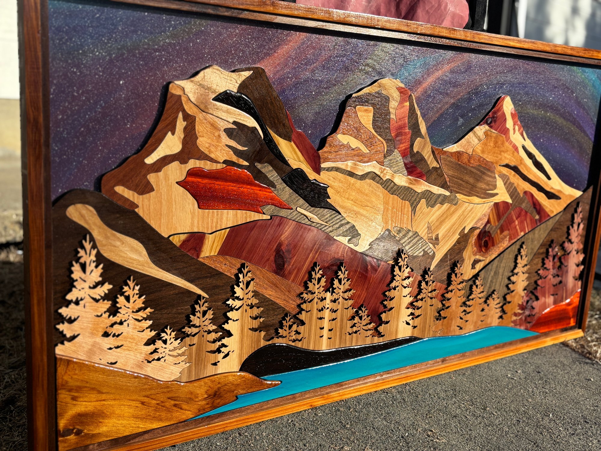 Crafted from a careful selection of different wood species and premium plywood, each layer works together to sculpt the mountains' depth, shadow, and ridge lines without a single drop of paint. The natural grain of the wood becomes the texture of the peaks. The tonal shifts between wood species become the play of light across the faces of the Sisters. At 48 × 24 inches, the piece commands presence — the way the mountains themselves do.